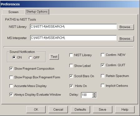 Sound Notification enables you to turn off any program notification sounds (such as Valence error warnings) if you prefer to do so. The Delay spin box holds the default value for MS Interpreter. See NIST Spectrum for more information on this setting.