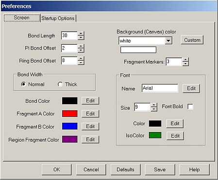 The options on this page should be largely self-explanatory. The default bond length and the settings for both alkyl and ring bond offsets (i.e. the distance between the parallel bonds) can be set here. Bond color is the color used for all bonds in the structure; the other colors refer to the markers used to indicate fragments. Fragment markers represents the size of the dots used to indicate atoms belonging to a fragment. You can also change the Font and font properties used for drawing structures. Font size is automatically adjusted by default based on the bond length, but this can be overridden. The Color option sets the default font color for all atoms other than isotopes such as deuterium or C13. The color used for isotopic atoms is set by the IsoColor option.