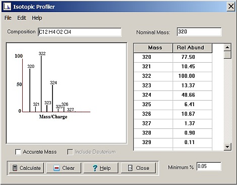 The default minimum abundance for the display of 0.5% can to changed to any value in the range of 0.01 - 99% by entering the desired minimum value in the text box near the bottom of the window. To display a high-resolution profile based on accurate mass values select the Accurate Mass option box. Note that unlike the nominal resolution profile which is presented normally, the accurate mass values are spaced equally along the abscissa rather than being spaced according to mass difference. This is done to facilitate display of all masses on the plot regardless of mass resolution. Also note that there are additional limits on the number of polyisotopic species that can be handled in high-resolution mode. The program will notify you if the requested calculation would exceed those limits.